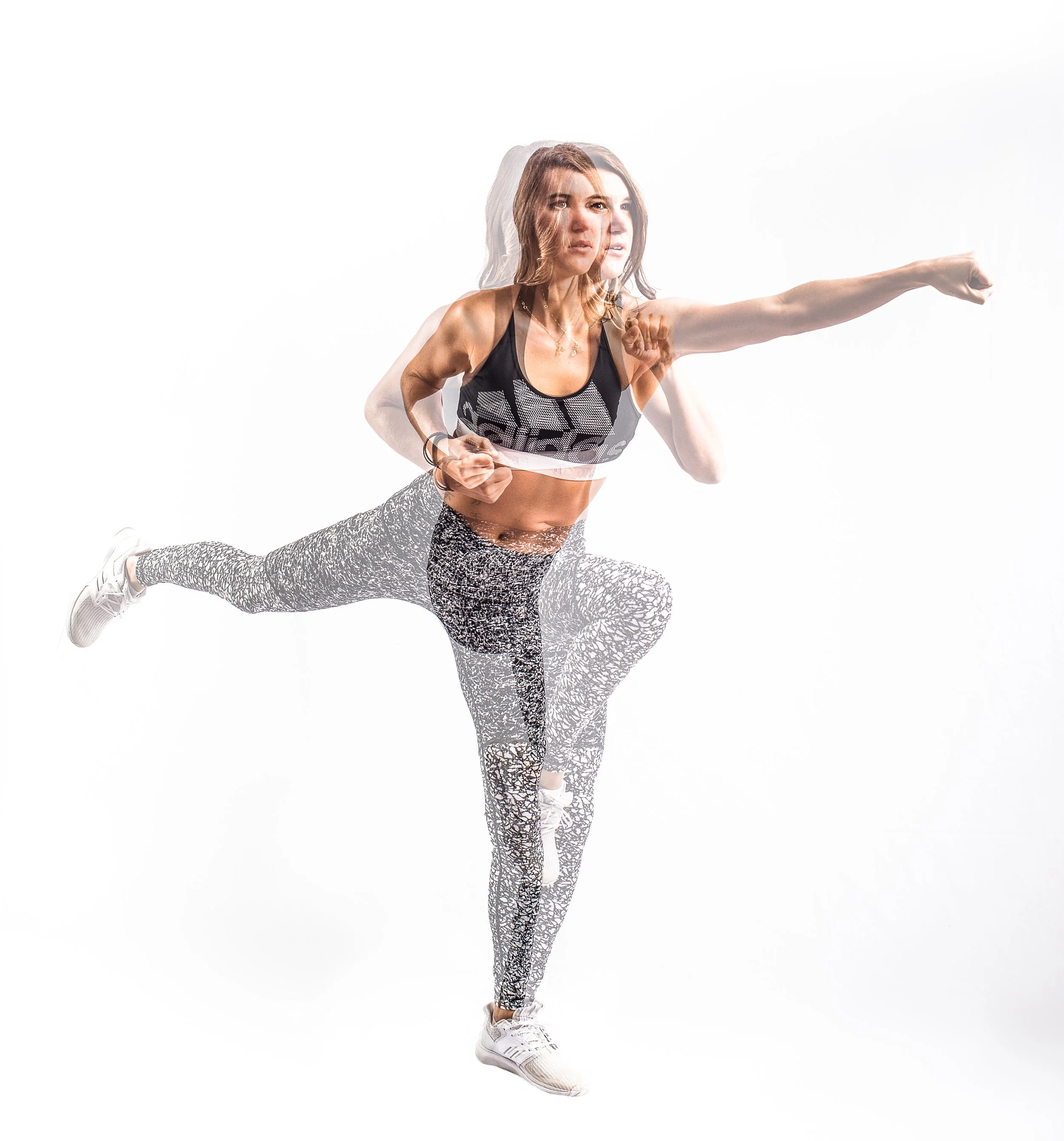 Double exposure of a woman in fitness attire, performing a kickboxing move with a forward punch and raised leg on a white background.