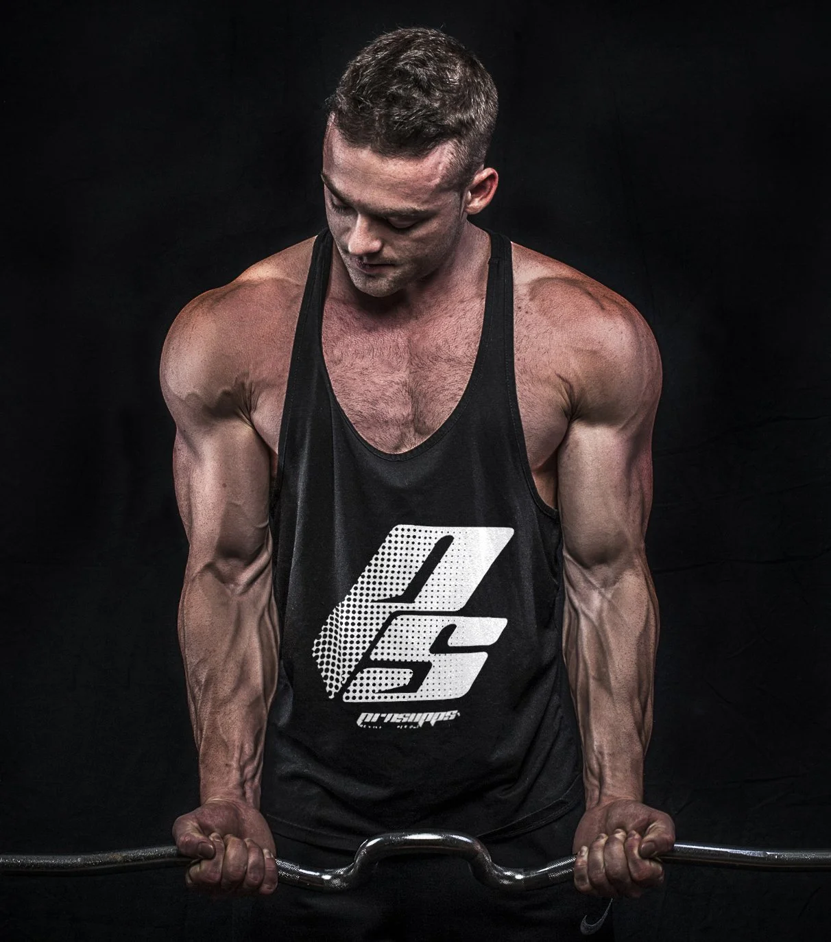 A muscular man wearing a black tank top lifting a barbell, with the left side of his body disintegrating into particles against a dark brick wall background.