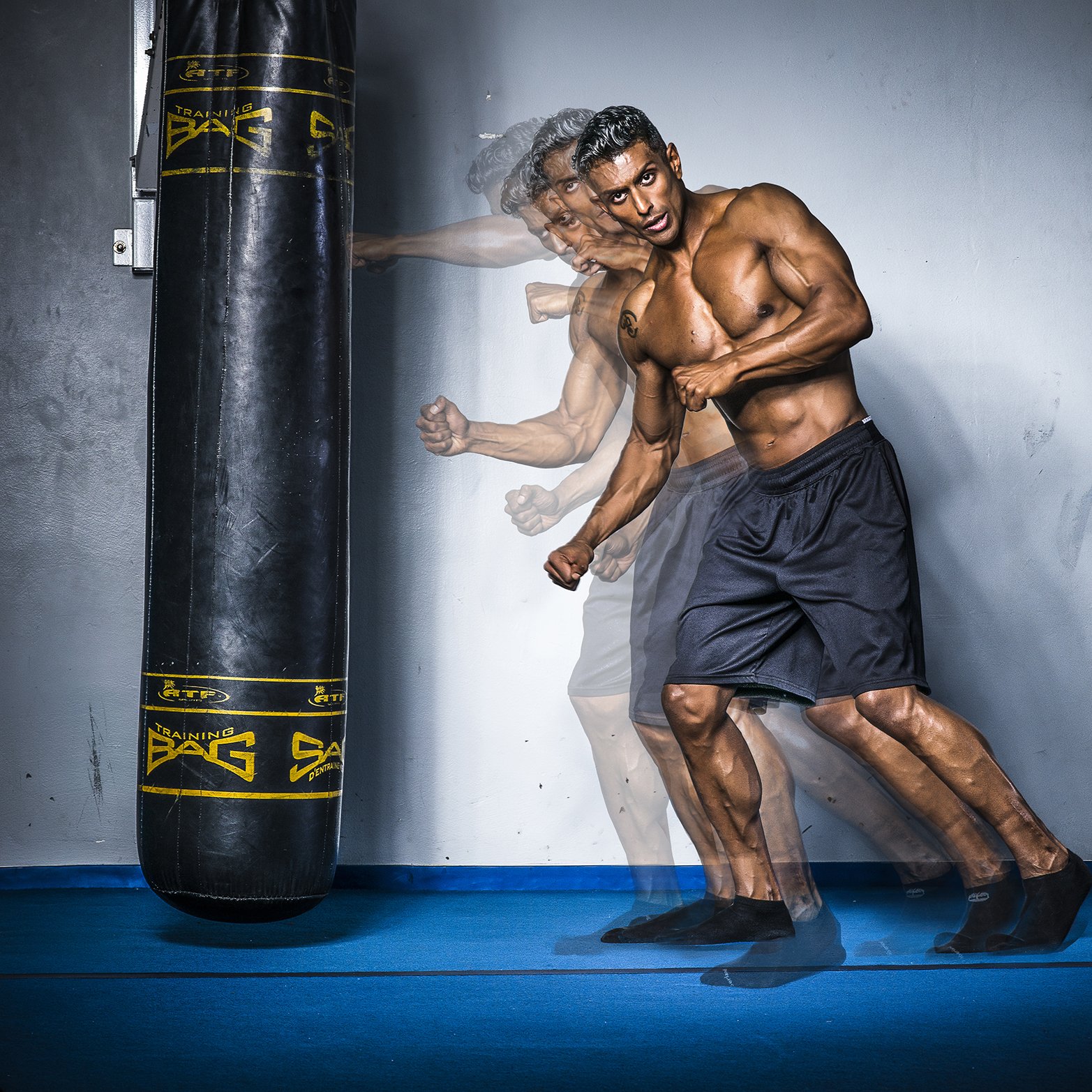 A shirtless man in gym shorts shadowboxing near a punching bag in a gym.